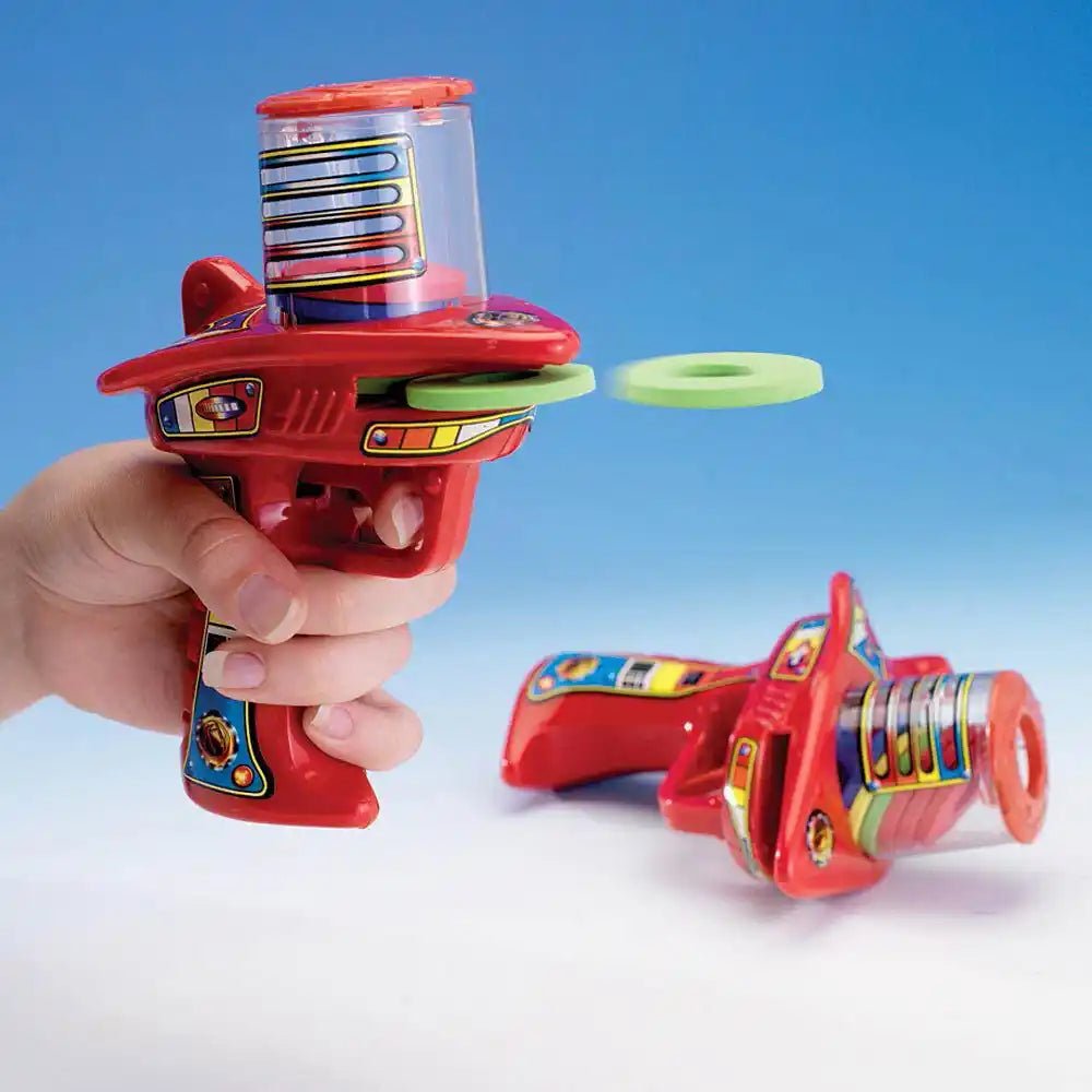 From the outer reaches of the galaxy come these secret weapons that are a blast of fun! Battery-free rapid-fire toys shoot safe, soft foam discs and have sturdy plastic construction. Set of two launchers (assorted colors) and 24 discs. Spring action. No batteries required. Recommended for ages 6+.