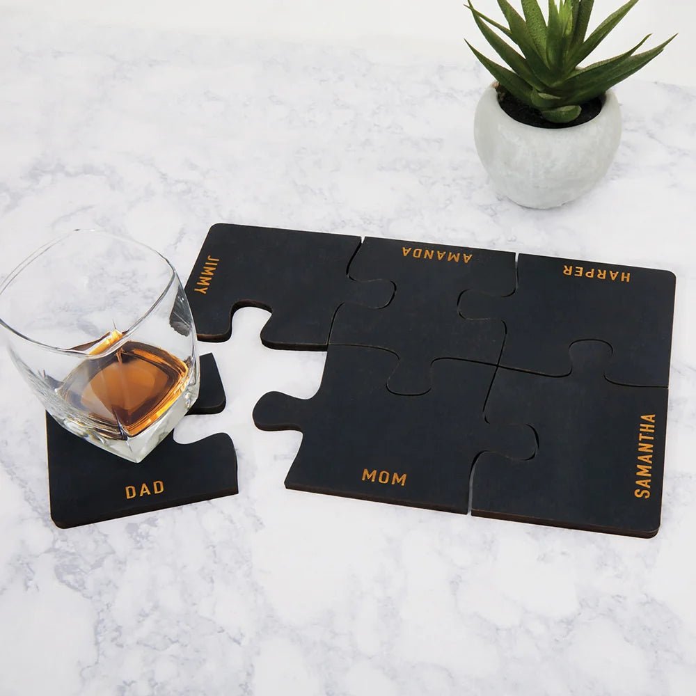 Add a clever and functional touch to your space with our personalized black wood puzzle coasters. Designed to interlock like real puzzle pieces, they’re both fun and practical—protecting your surfaces from moisture while creating a unique, connected look. Made from sturdy birch plywood and painted a sleek matte black. Specify name ( up to 12) characters, for each coaster in the set. Perfect for coffee tables, home offices, or as a thoughtful gift for family and friends.